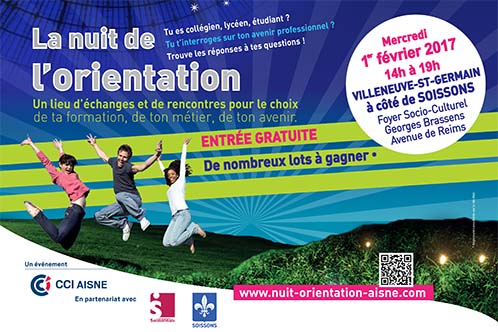 La Nuit de l’Orientation permet à un large public de trouver des réponses quant à son avenir professionnel dans un environnement festif et ludique. Organisée pour la première fois dans le GrandSoissons en 2016, elle avait attiré près de 1300 visiteurs. Une nouvelle édition aura lieu le 1er février 2017 de 14h à 19h, à la salle Georges Brassens de Villeneuve Saint-Germain.
